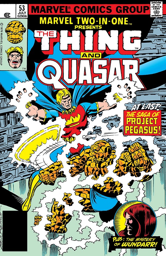 It has been some time since The Thing has been back to see Wundarr at Project Pegasus and sure, he has been busy, but he realises that it is not necessarily reason enough and he feels somewhat ashamed because of it. Arriving at the facility, things have changed and he goes through a pretty intensive screening process, cracking jokes as he is known to do until he is finally admitted and faced with an enemy. Once again, as seen in so many other titles and this one included, Ben Grimm mistakes friend for foe though to be fair, he had never met Quasar before this point and instead thinks him the former Marvel Boy/Crusader who had gone mad and just a little violent. A tussle breaks out of course and soon, not only does the reader get a little history lesson on Marvel Boy, but on Quasar as well. Thanks to creators Mark Gruenwald and Ralph Macchio with John Byrne and Joe Sinnott, they soon get that bit of action out of their system, it is finally time to see what happened to Wundarr since readers last saw him and it is not a good thing as he has shut himself off from the world in a kind of comatose state. Not only that, but somehow he manages to drain the power from everything around him including The Thing who just wants to see the poor guy. There are a couple of twists of course, the first being that there is a traitor within Project Pegasus, hinted to be Thomas Lightner, though little is done about that in this current issue. The second is a sub-plot involving Thundra, though how it factors into what happens during this issue remains to be seen and last but not least, a character reveal with a cliff-hanger. All of it makes for a good book, though it did feel like little happened as a lot of it was wasted on trivialities and the down-time taken by The Thing after seeing Wundarr. It did not detract from what was going on, this obviously being the first of a multi-part story, but it would have been nice to see the pace a little quicker than it was and more meat on the bones with less throwaway moments. Altogether, it made for an entertaining package and nice to see was Byrne back on the book, the man drawing one of the more definitive versions of The Thing ever to be put on the page.