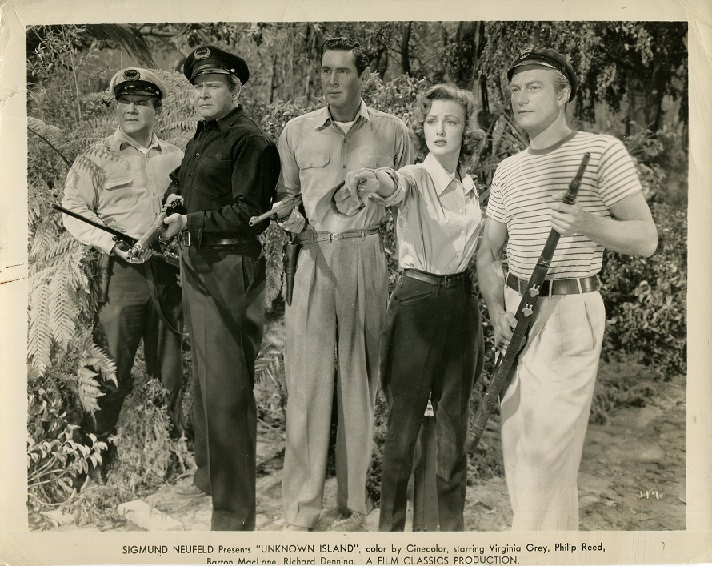 For a movie made on the cheap, it looks good and, more importantly, would provide a bit of fun over the course of its seventy-five minutes. Most of that would come from the light, breezy atmosphere director Jack Bernhard would foster throughout, and the easy performances of its cast. Virginia Grey would end up being both the eye candy and the damsel in distress in this endeavour, while being the love interest for not one, not two, but three men. Phillip Reed would pose as her fiancée, and Barton MacLane as the overbearing and over-the-top Captain Tarnowski. Coming in third but ending up with the girl when all was said and done would be Richard Denning as the man known as Fairbanks. He, too, would end up on the boat with the rest of the players, as he had previously been to the island of dinosaurs, and being the only survivor meant he might have a perspective that the others could use.
